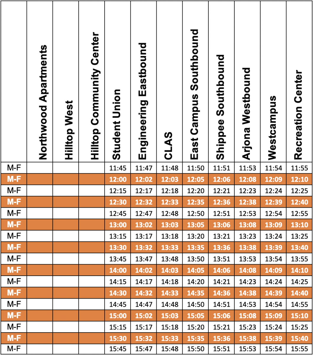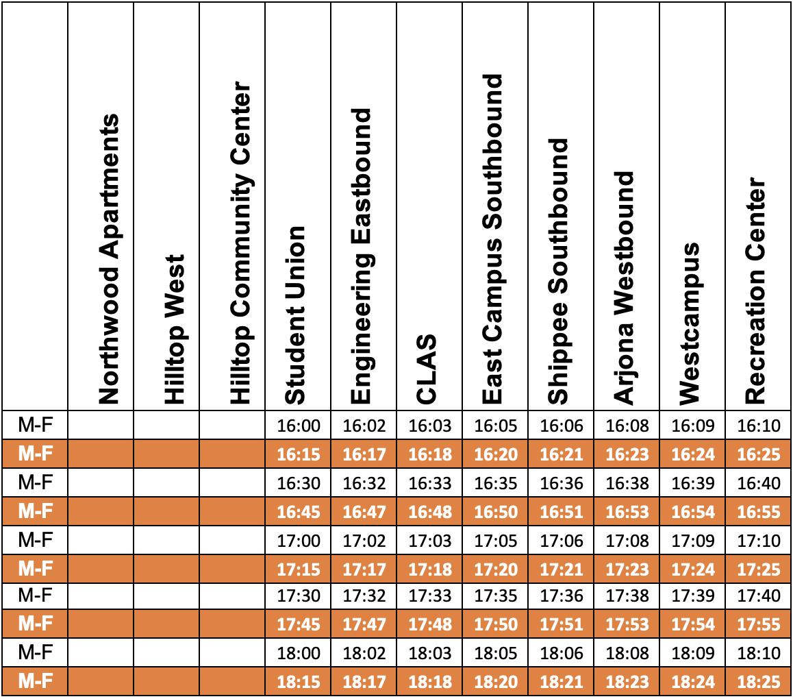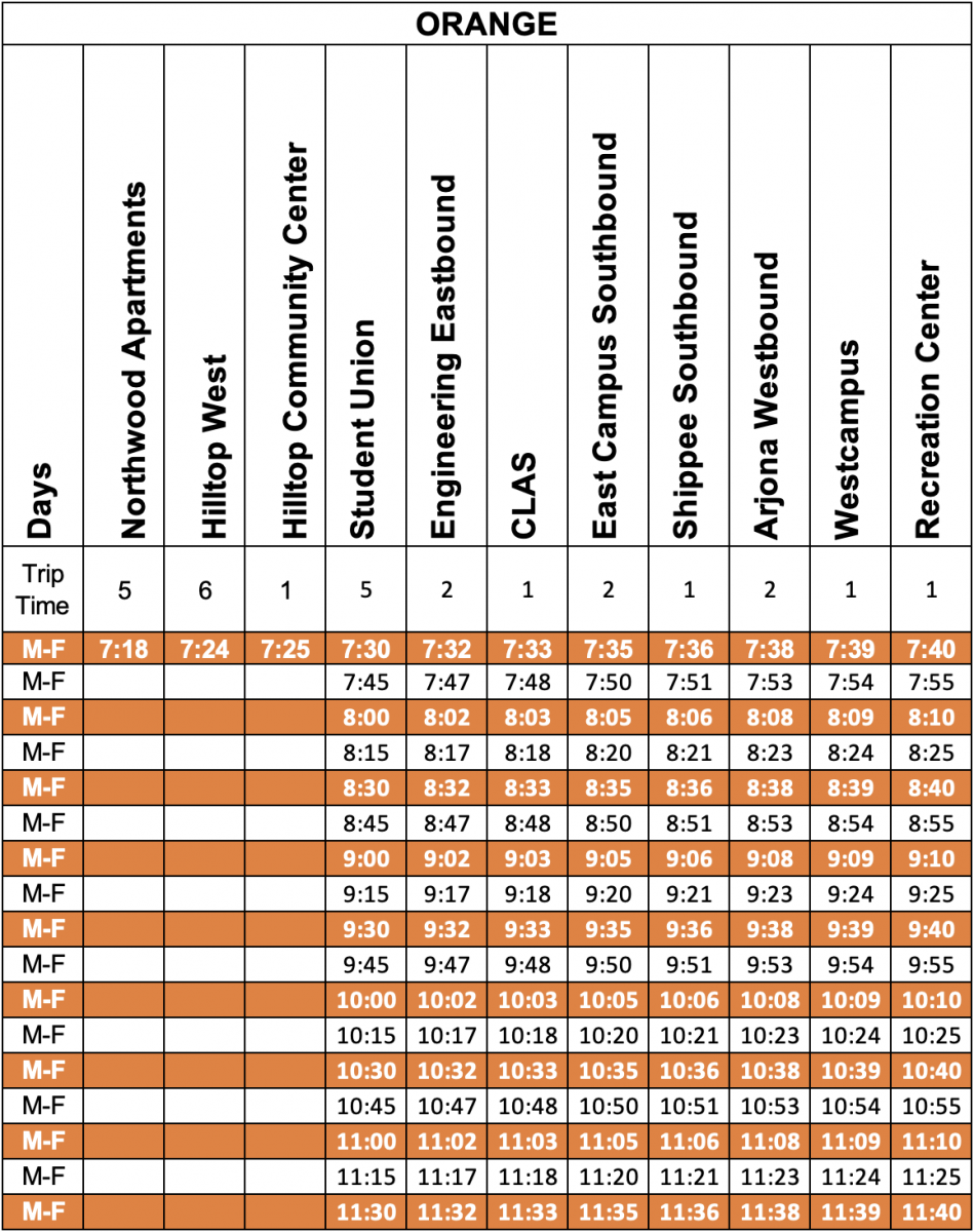 The Orange Line is in service Monday through Friday throughout the Fall and Spring semesters. There is no Orange Line service during weekends and breaks.