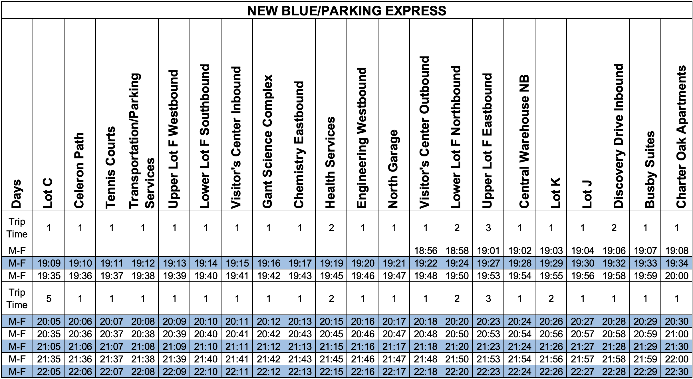 The Blue/Parking Express is in service Monday through Friday throughout the Fall and Spring semesters. There is no Parking Express service Saturday, Sunday, or during break sessions.