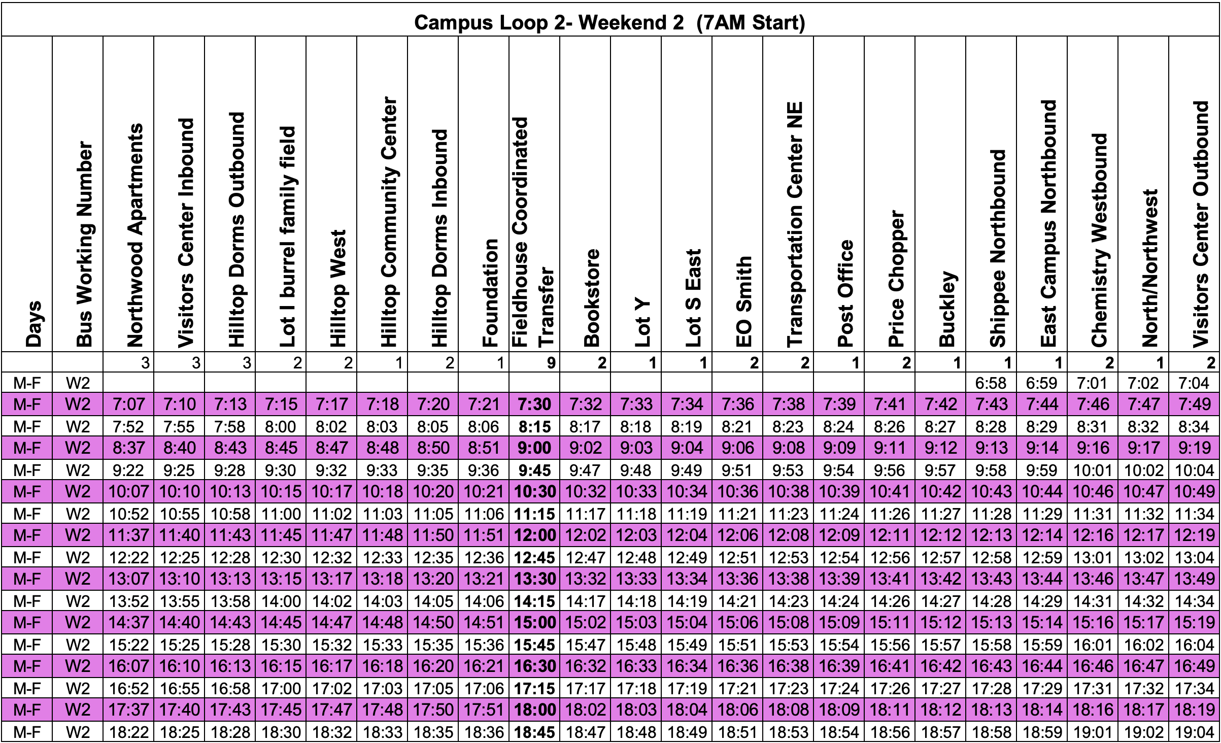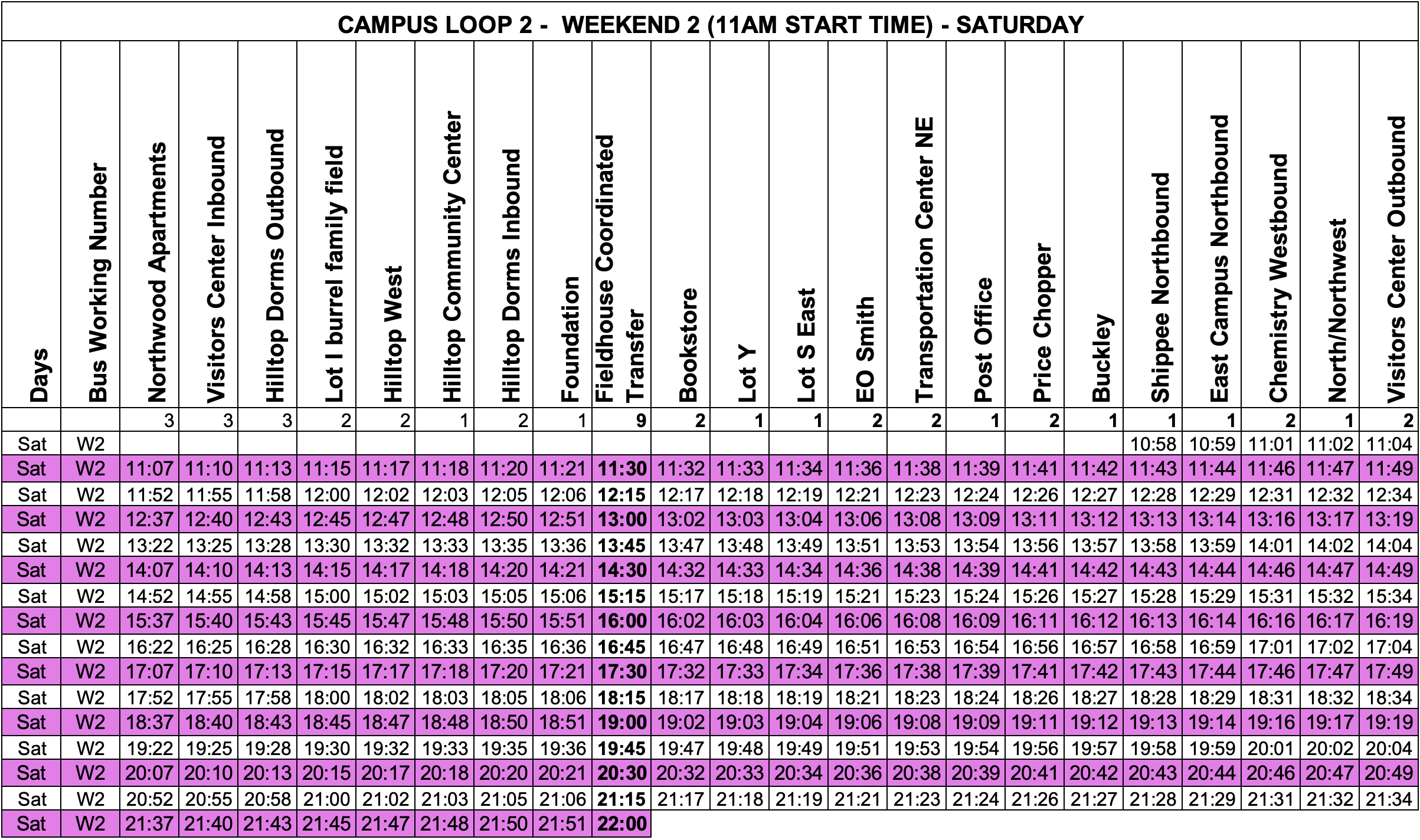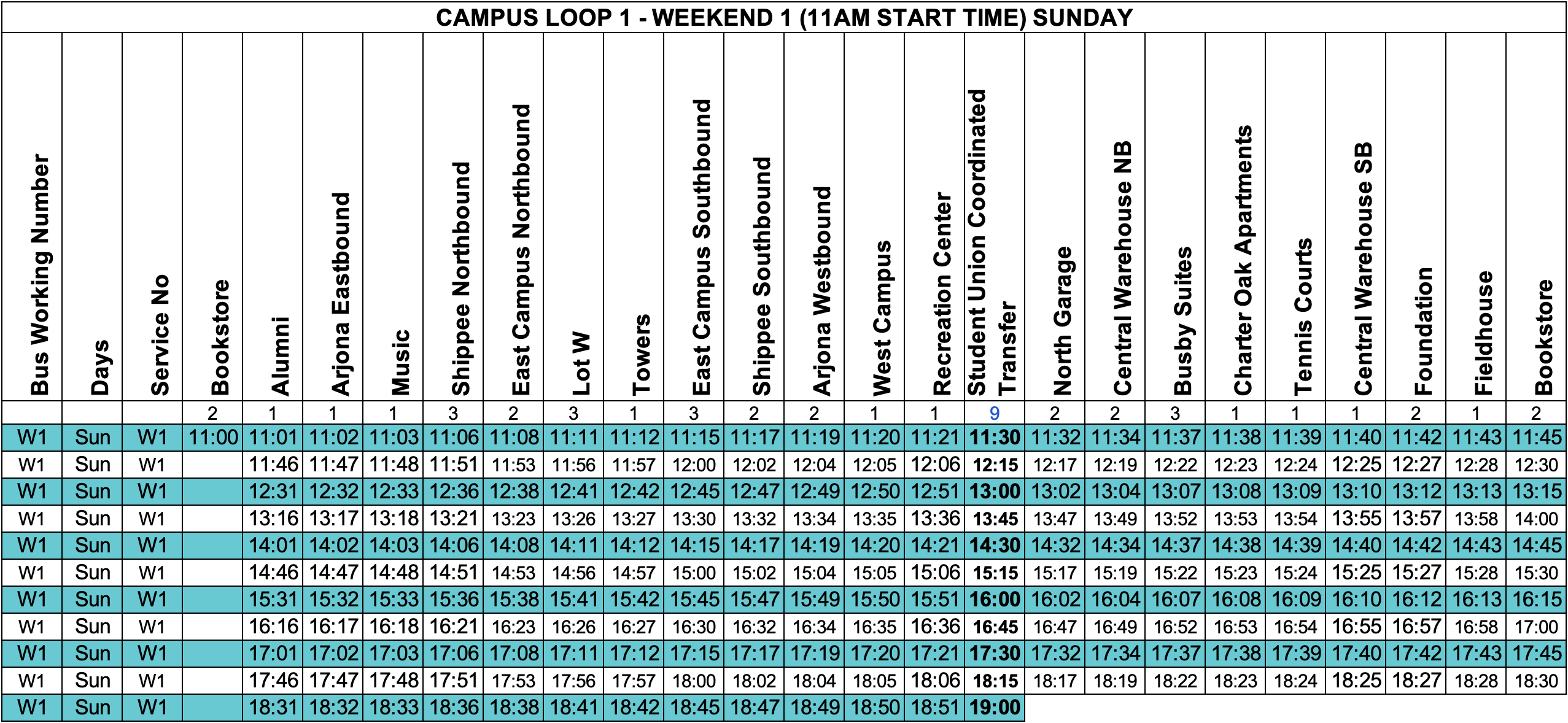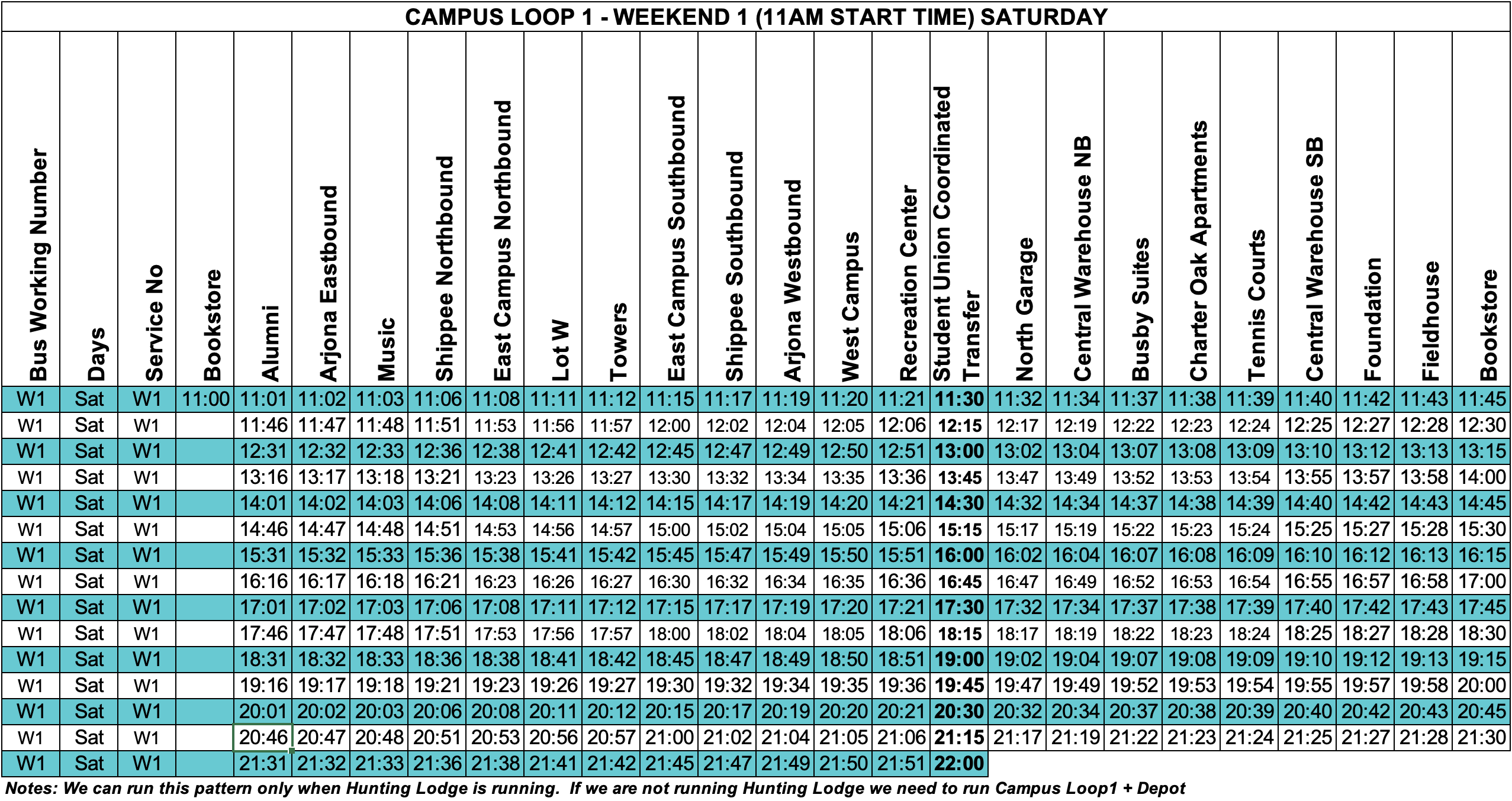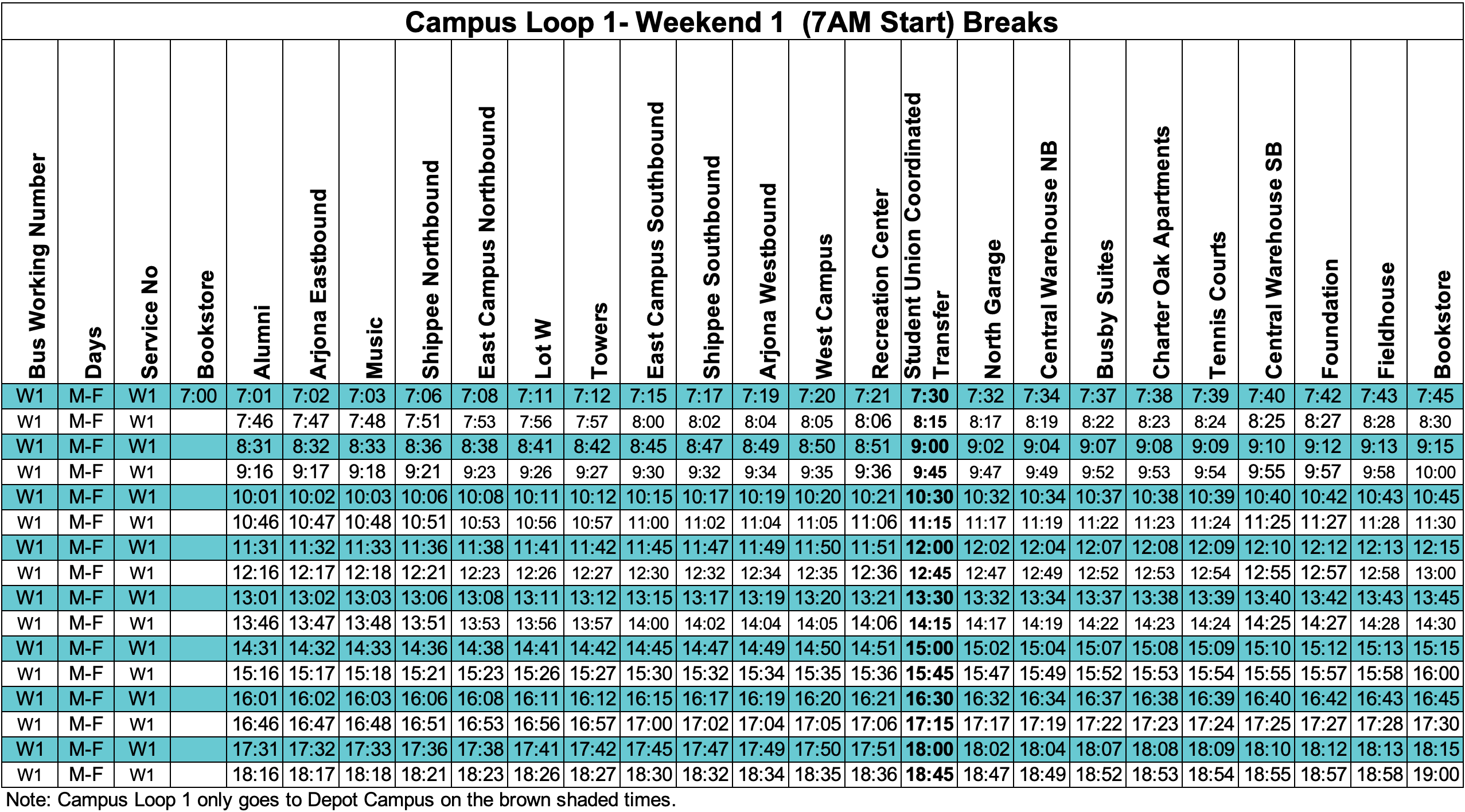 The Campus Loop 1 & 2 routes run Monday through Friday DURING SUMMER/WINTER/SPRING BREAKS ONLY (no weekend service during breaks), and the Weekend 1 & 2 routes run Saturday and Sunday throughout the semesters. The patterns are the same. The start and end times change during breaks and weekends.