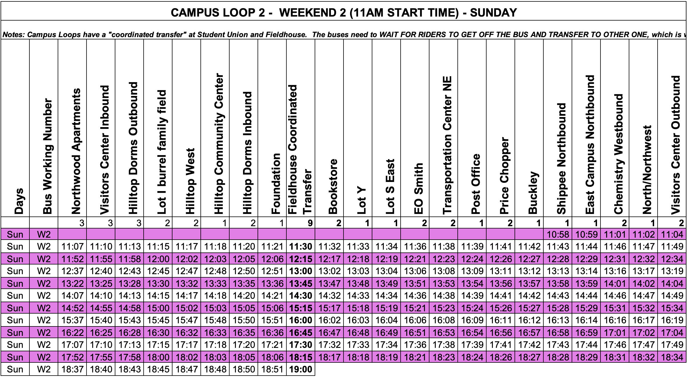 The Campus Loop Shuttles (“Campus Loop 1 & Campus Loop 2, or CL1&2), also known as Weekend Shuttles (Weekend 1 & 2, or WK1 &2), are designed to service passengers on the Storrs campus during breaks and on the weekend.