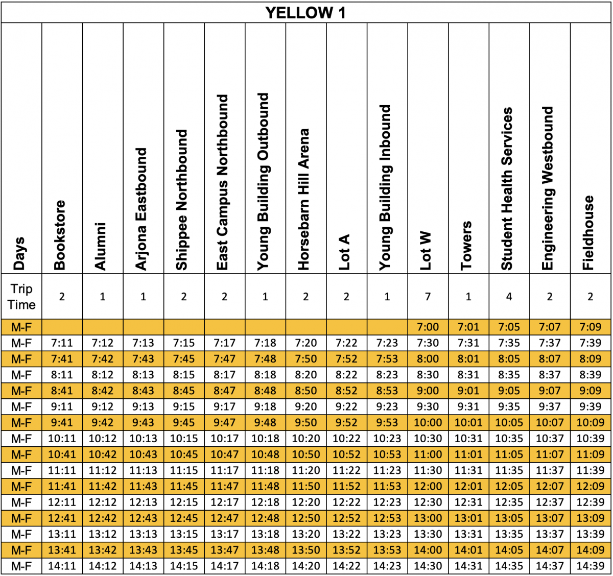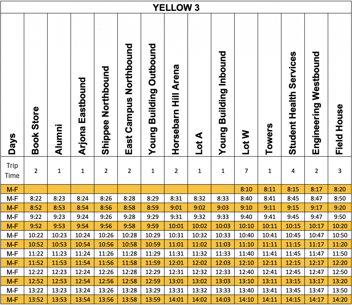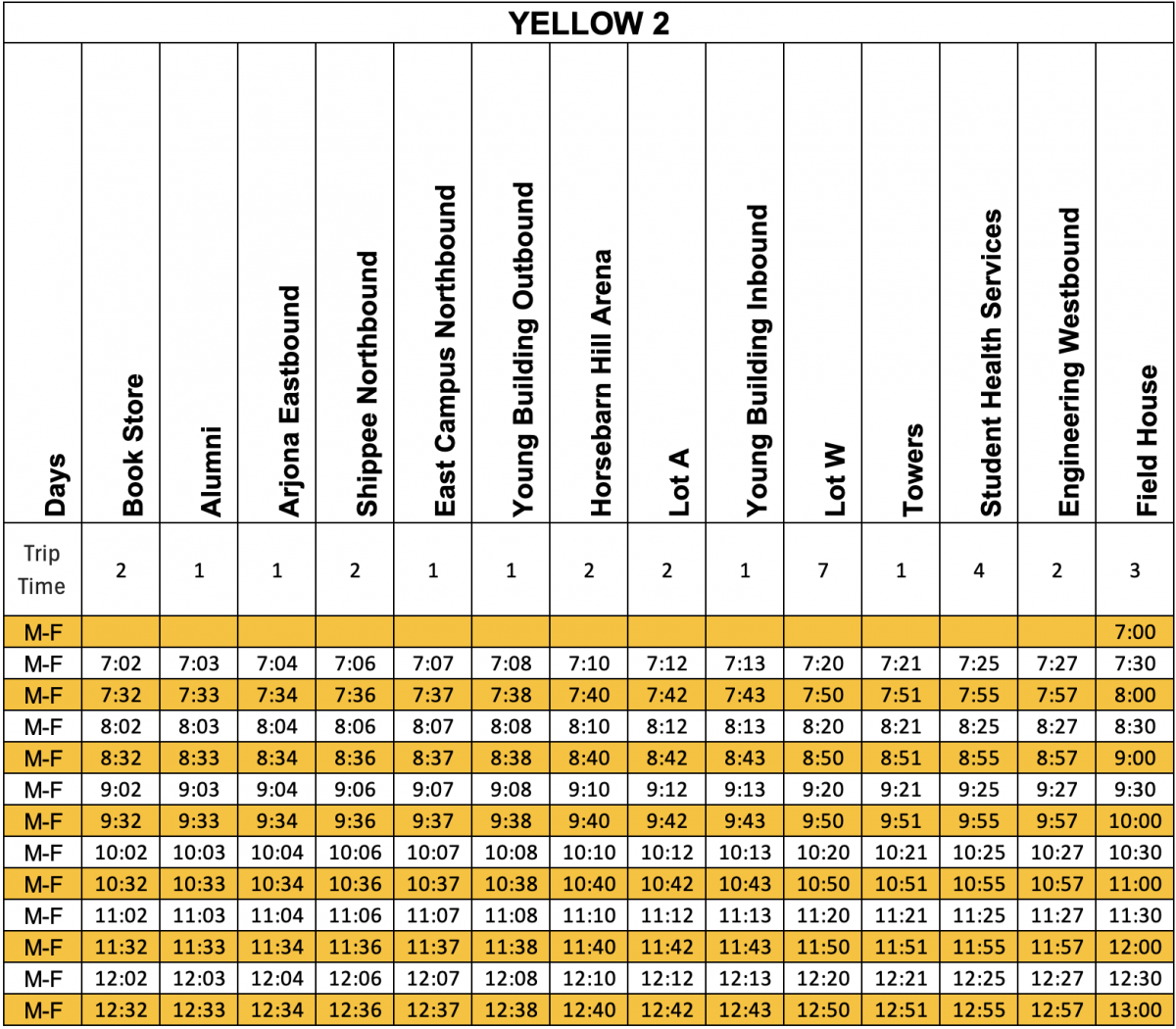 The Yellow Line is in service Monday through Friday throughout the Fall and Spring semesters. There is no Yellow Line service during weekends or breaks.
