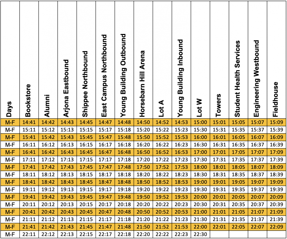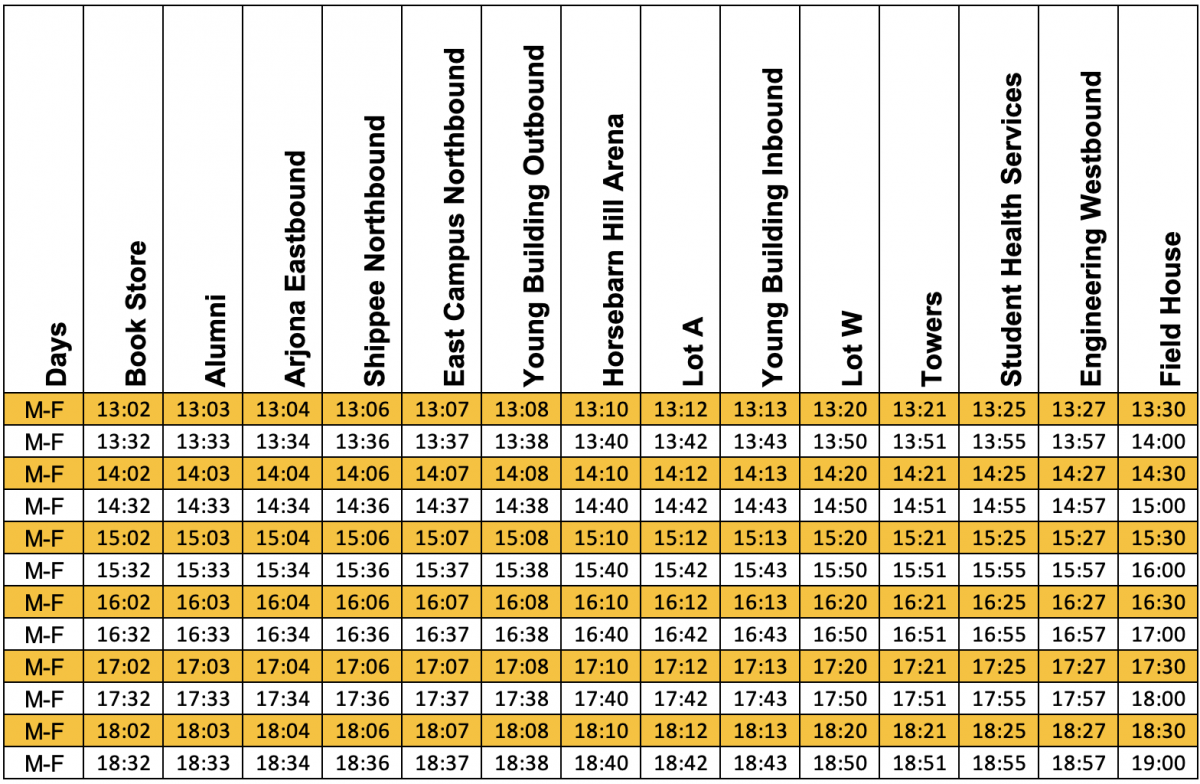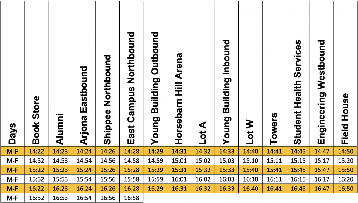 The Yellow Line is in service Monday through Friday throughout the Fall and Spring semesters. There is no Yellow Line service during weekends or breaks.